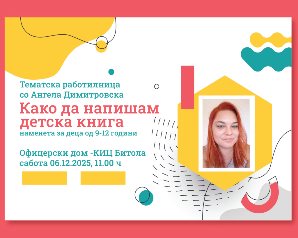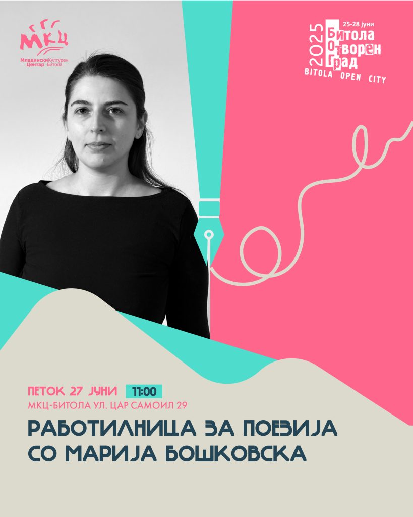 Работилница за пишување на поезија со Марија Бошковска Петок • 27 јуни • 11:00 локација МКЦ Битола, ул. Цар