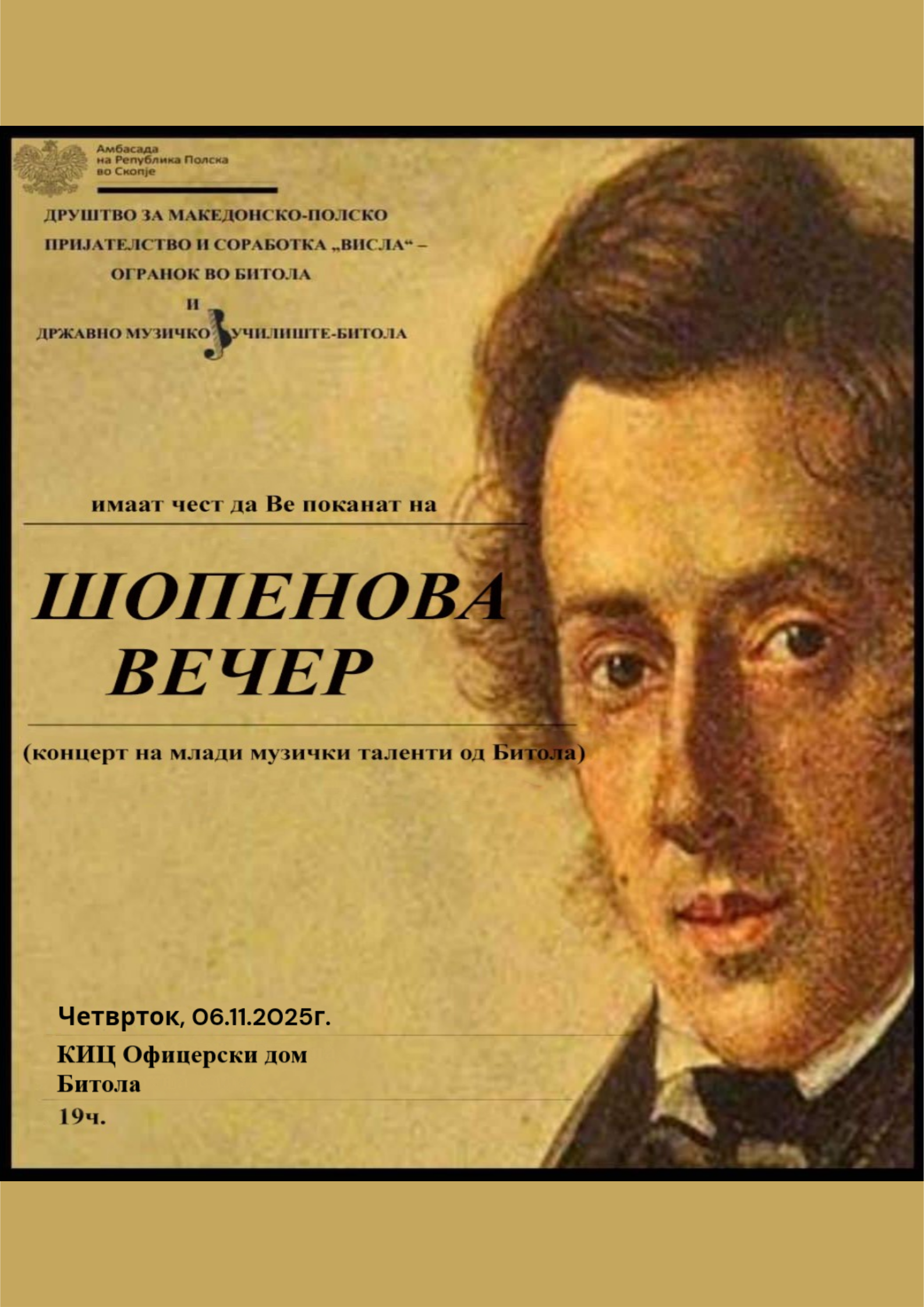 Ве очекувама на „Шопенова вечер“ на 06.11.2025, во 19.00 ч. во Офицерски дом-КИЦ Битола.